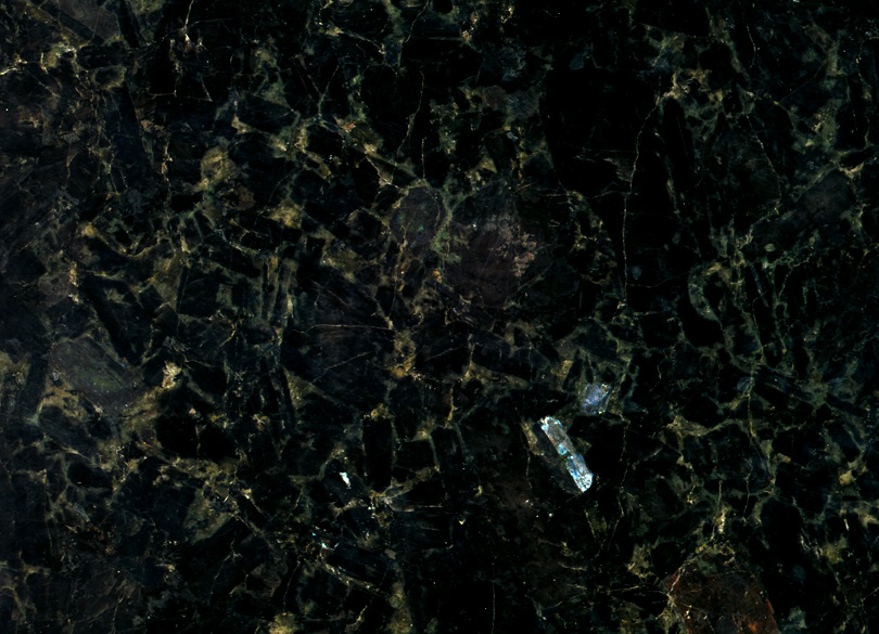 Irina Blue Labradorite has a lot of green veins, black background and small blue spots.